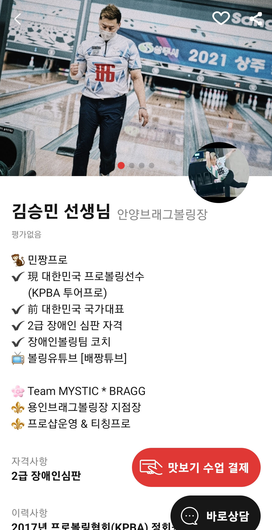 김승민 선생님은 용인브래그볼링장과 안양브래그볼링장에서 활동 중이에요.