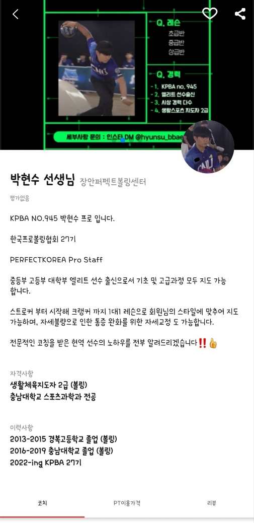 박현수 선생님은 장안퍼펙트볼링센터에서 활동 중이에요.